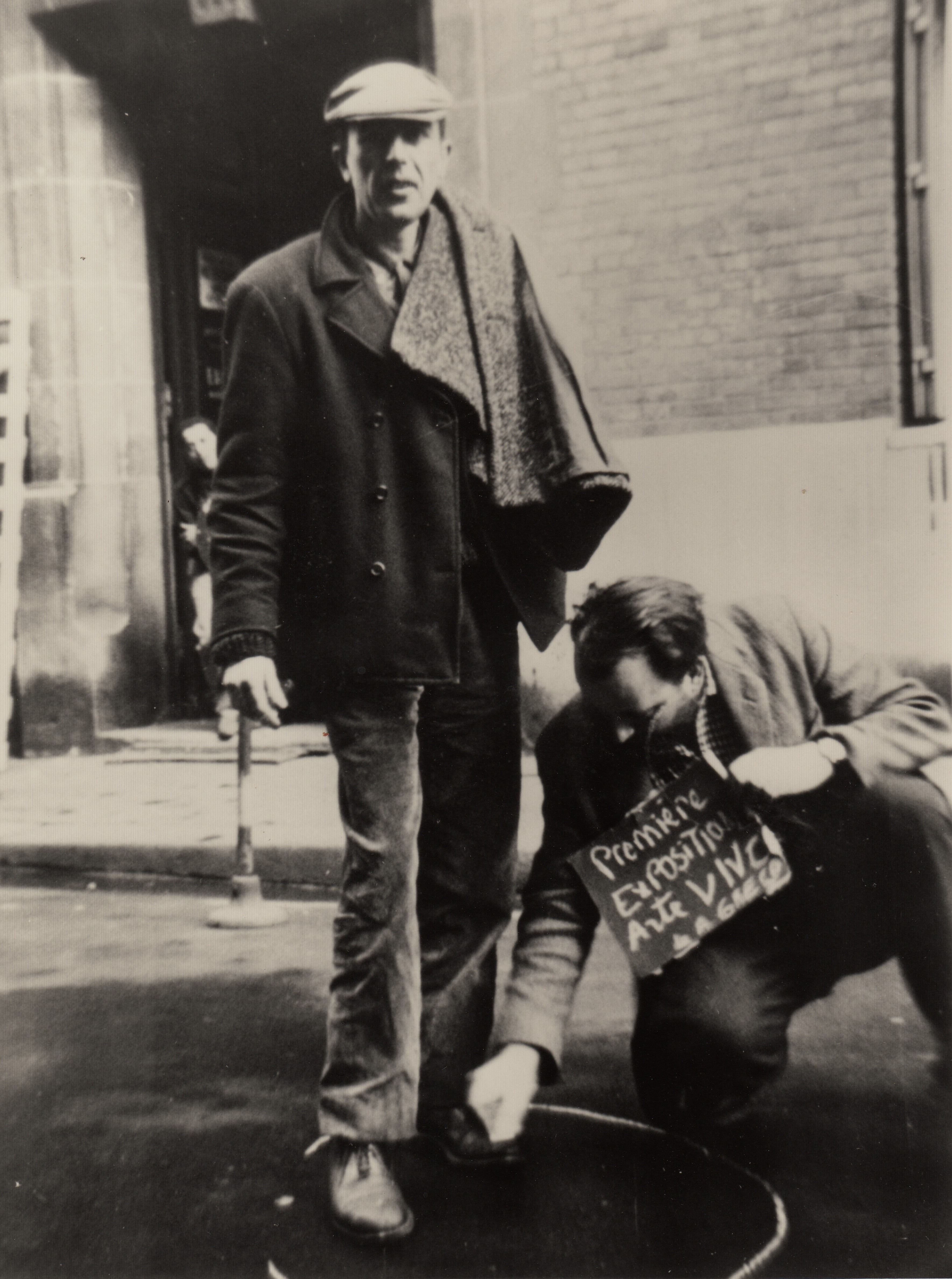 Alberto Greco con Alberto Heredia durante la Première exposition arte vivo de A. Greco en París 1962