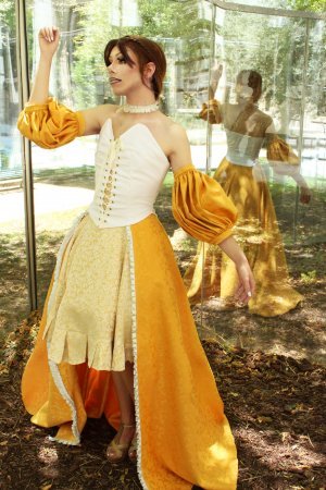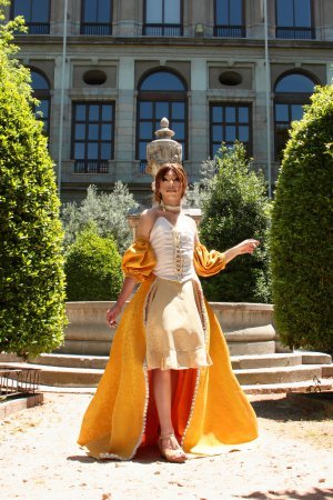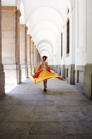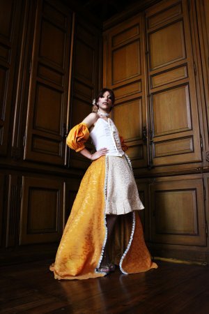 Partiendo de la rigidez de los personajes del cuadro, diseñó un vestido y maquillaje con los que poder contemplar su cuerpo liberado en la superficie de cristal: las vitrinas del Museo, por fin, se convierten en espejos.